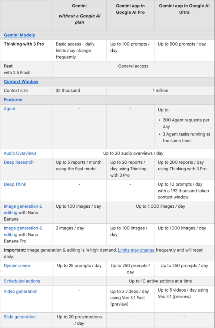 Öte yandan; ücretsiz kullanıcıların Gemini 3 Pro için günlük kullanım hakkı, artık 5 istem şeklinde değil. Google’ın açıklamasında ücretsiz kullanıcıların Gemini 3 Pro’ya “Temel Erişim” hakkı olacağı ifade ediliyor ve burada belirli bir kotadan bahsedilmiyor.