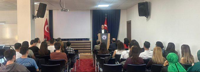 Üniversite öğrencilerinin yoğun ilgi gösterdiği programda kültür, medeniyet ve değerler ekseninde bir konuşma yapan Türkiye Yazarlar Birliği (TYB) İstanbul Şube Başkanı Yazar Mahmut Bıyıklı, “Gençlerimiz ve dilimiz bizim manevi vatanımızdır. Fiziki vatanımızı muhafaza etmek için nasıl savunma sanayine yatırımlar yapıyorsak manevi vatanımız olan dilimize de aynı hassasiyetle sahip çıkmalıyız ifadelerini kullandı.